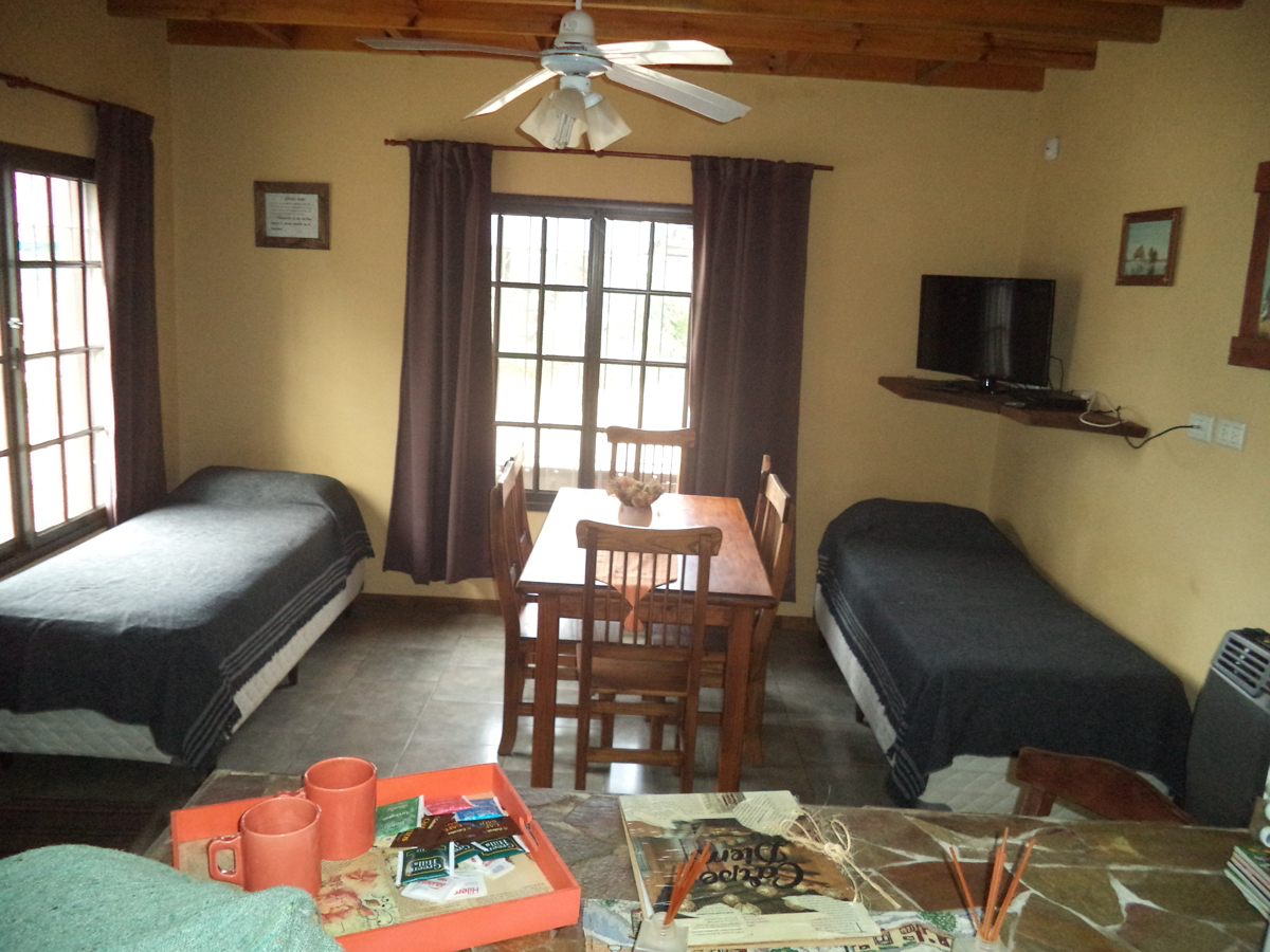 Capacidad máxima, hasta 3 personas. Cabaña distribuida en dos plantas, contando en planta baja con cocina comedor, y en la planta alta con dormitorio para los huéspedes y baño.
